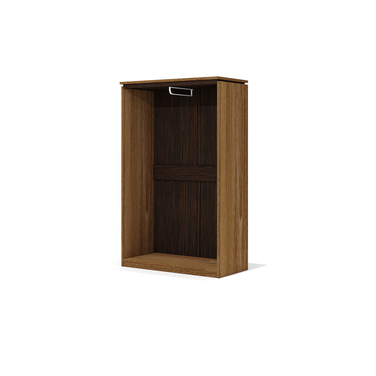 Невысокий шкаф для верхней одежды из кабинета руководителя ON.TOP. Верхний топ, каркас шкафа и дверцы выполнены из ЛДСП толщиной 18 мм, цвет "Рэд Фокс". Дверцы шкафа обрамлены оригинальной рамой. Проставка топа из ЛДСП 16 мм, цвет "венге". Выдвижное вешало крепится к верхней крышке шкафа. Задняя стенка ДВП толщиной 3 мм, цвет "Венге"