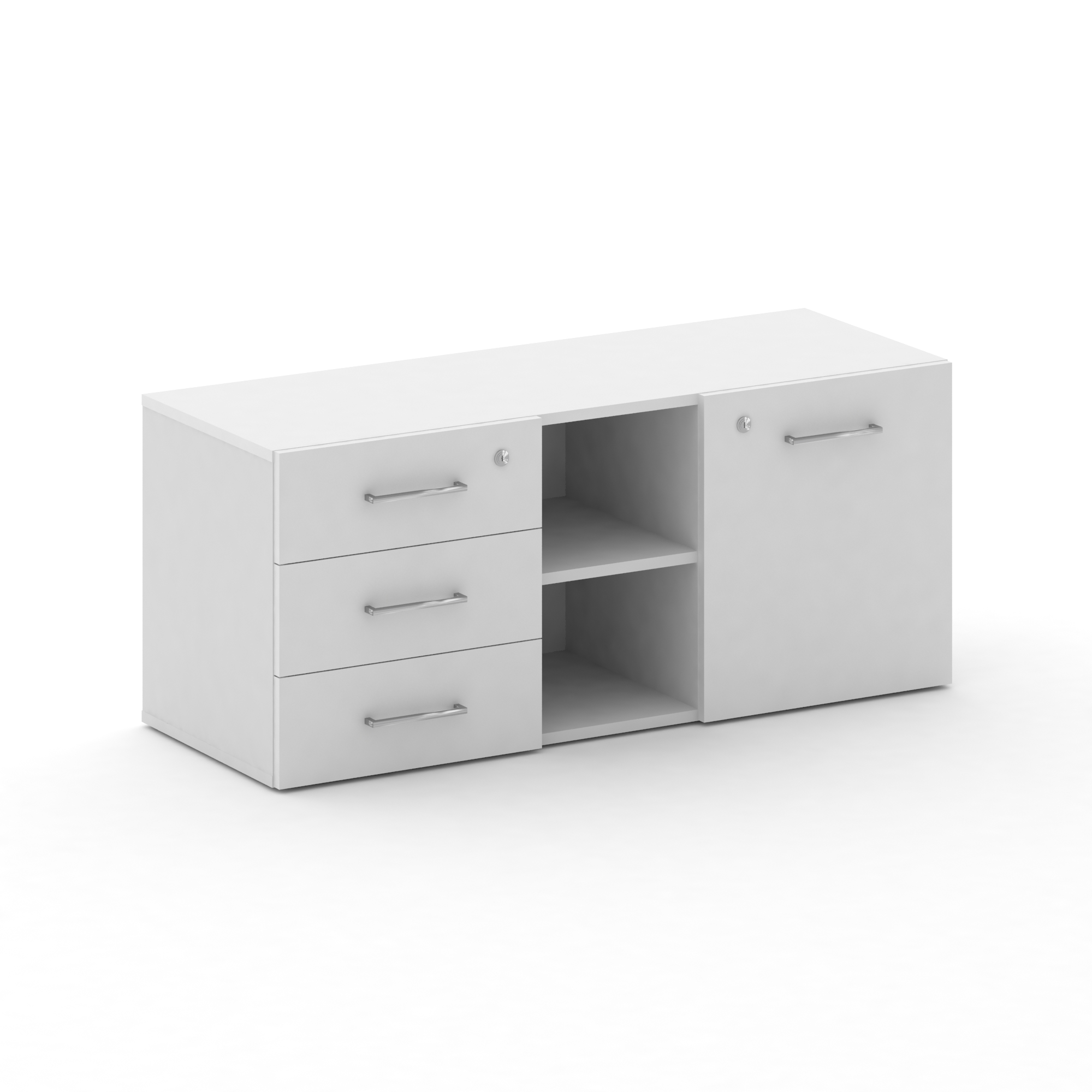 Широкая тумба с 3-мя ящиками, нишей и отделением с дверцей. Ручки металлические, хромированные, в виде скобы. Три ящика с замком на верхний ящик. Направляющие ящиков с доводчиком. Петли дверцы, так же с доводчиком. Устанавливается на регулируемые подпятники.
