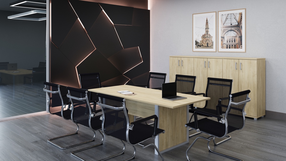 - Большой выбор аксессуаров и дополнительного оснащения: стандартные приставки, конференц-приставки, тумбы для оргтехники, греденции, стеллажи, экраны.