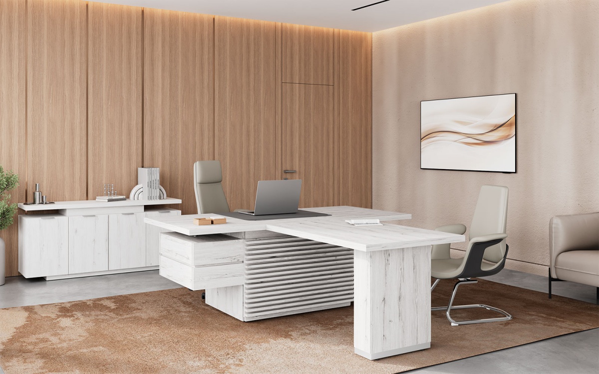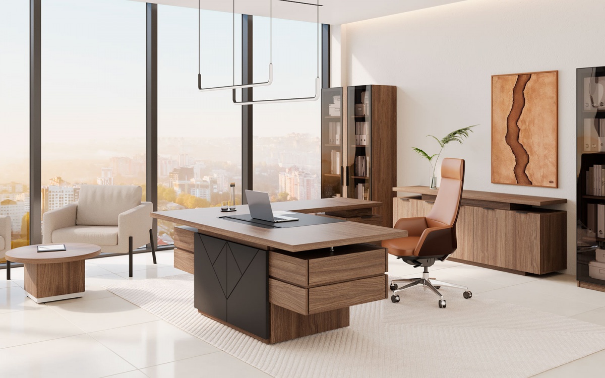Комплект углового рабочего места руководителя TS-200.K3 Time. Столешницы из ЛДСП толщиной 40 мм. В плоскость столешницы стола вмонтирован бювар размером 800х580 мм, обтянутый экокожей. Цвет экокожи:чёрный для цвета «Палдао» или антрацит для цвета «Дуб Эльза». Столешницы и опоры столы отторцованы кромкой ПВХ толщиной 2мм. Состав комплекта: стол руководителя TS-200 , подстолье стола закрывает декоративная панель TS-100.1 , слева и справа -подвесные тумбы TS-24 Time ,2шт., сбоку- приставная тумба TS-12 Time , брифинг-приставка TS-10 Time для приёма посетителей.