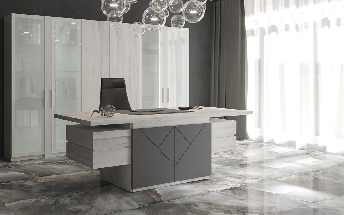Стол руководителя TS-200 Time. Столешница из ЛДСП толщиной 40 мм. В плоскость столешницы вмонтирован бювар размером 800х580 мм, обтянутый экокожей. Цвет экокожи:чёрный для цвета «Палдао» или антрацит для цвета «Дуб Эльза». Столешницы и опоры столы отторцованы кромкой ПВХ толщиной 2мм.