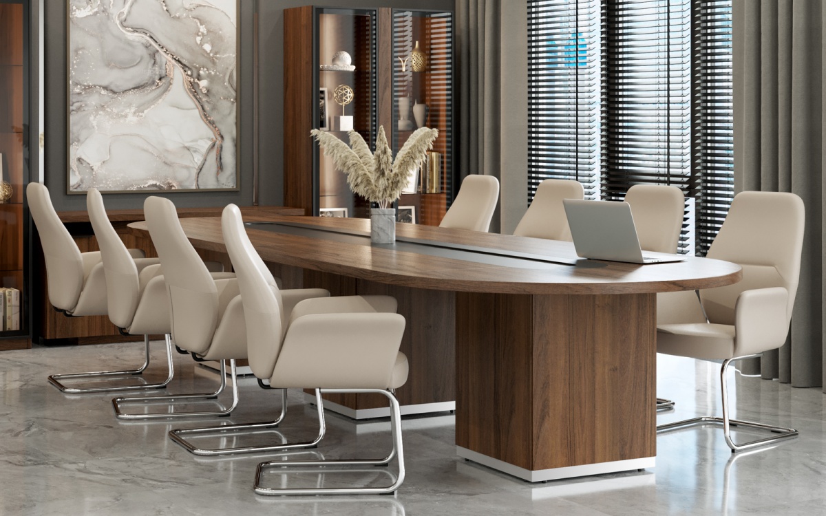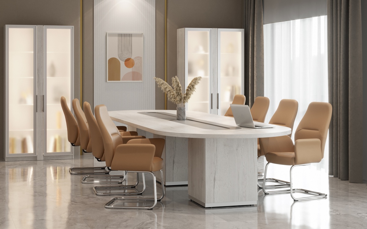 Составной овальный стол для переговоров TS-140.140.12 Time на 12-16 человек. Состоит из базы, круглого составного стола TS-140 , 1шт и дополнительного прямоугольного модуля TS-140.1 ,2 шт. Толщина столешницы- 40 мм