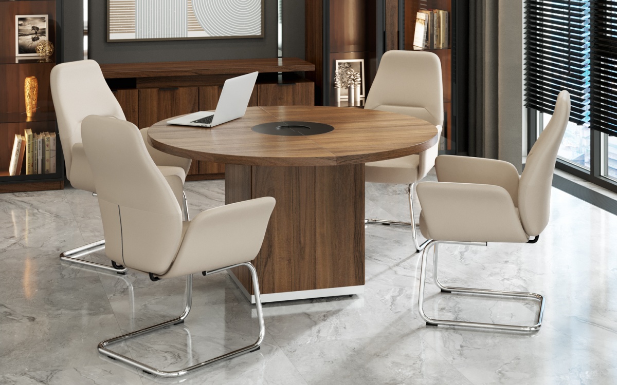 Круглый конференц-стол TS-140 Time изготовлен из ЛДСП. Составная, из 2-х половин, столешница диаметром 1400 мм и толщиной 40 мм установлена на основание в виде короба. В центре столешницы вмонтирована круглая вставка диаметром 400 мм с углублением для канцелярских принадлежностей. Вставка состоит из 2-х половин, изготовлена из МДФ и облицованная вакуумным методом ПВХ-пленкой черного цвета в тиснении «шагрень».