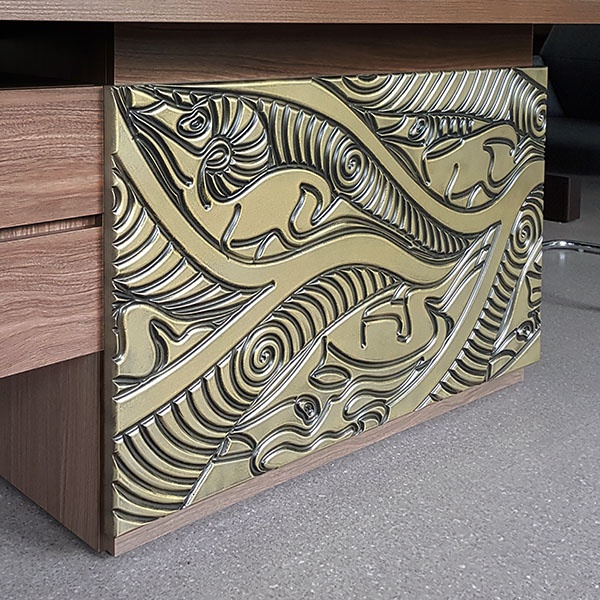 Декоративная накладная панель TS-100.4 Time устанавливается на столы руководителя TS-180 или TS-200 . Закрывает подстолье стола, придавая оригинальный внешний вид. Панель изготовлена из МДФ толщиной 25мм. На лицевой стороне размещен этнический рисунок по мотивам старинных гравировок со стилистическим изображением.