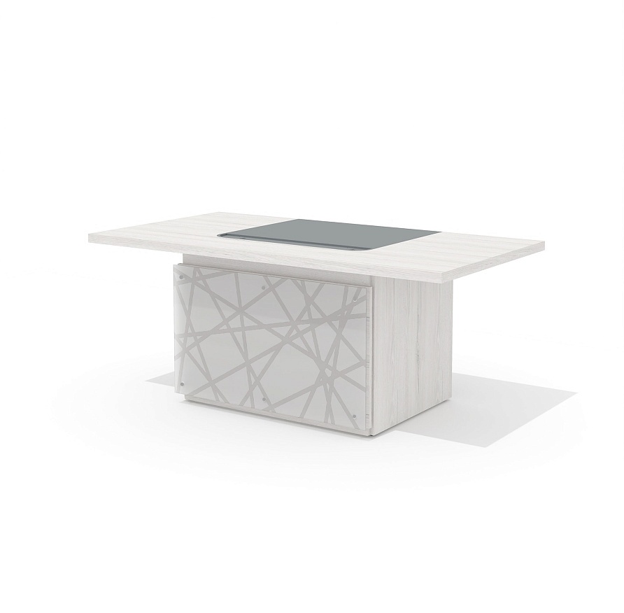 Декоративная стеклянная накладная панель TS-100.3 Time устанавливается на столы руководителя TS-180 или TS-200 . Закрывает подстолье стола, придавая оригинальный внешний вид. Панель выполнена из закаленного тонированного в массе стекла толщиной 4 мм серого оттенка с полированной кромкой. Основание накладного траверса выполнено из ЛДСП. Стекло крепится к основанию через металлические проставки, цвет "никель". По всей площади оборотной стороны стеклянной панели размещен геометрический узор, выполненный из ПВХ-пленки.