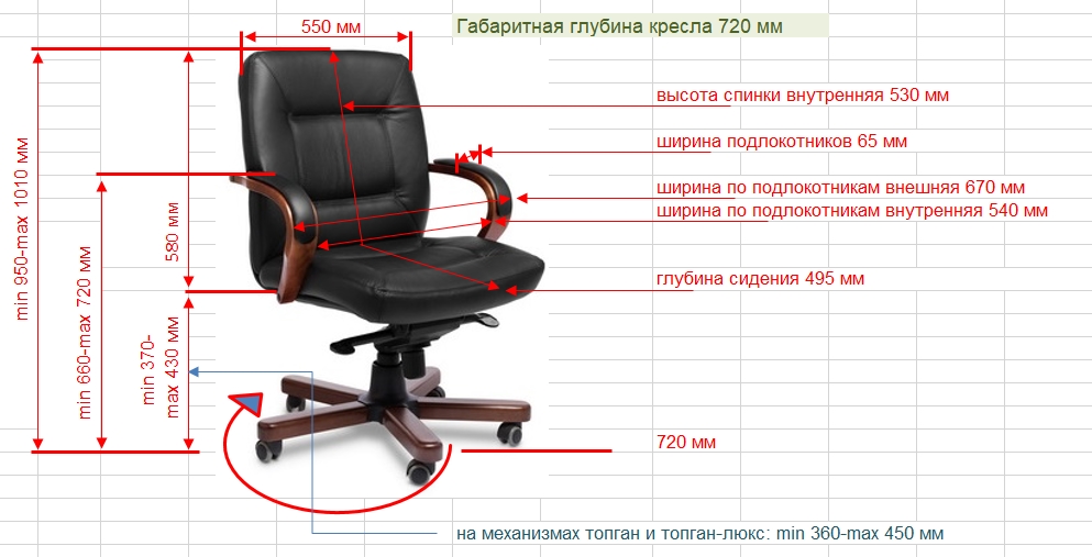 Элитное кресло со средней спинкой для руководителя. Лицевая часть обивки спинки и сиденья выполнены из натуральной кожи, задняя часть – из экокожи. Подлокотники – шпонированная гнутоклеенная фанера в цвете «тёмный орех», накладки из кожи. Спинка с декоративными утяжками. Механизм качания – мультиблок с фиксацией кресла в 4 положениях, регулировка жесткости качания по весу сидящего; газ-лифт (3-я категории стабильности) для регулировки по высоте; прорезиненные колеса. Пятилучье металлическое с накладками из массива бука. Максимальная нагрузка - 150 кг.