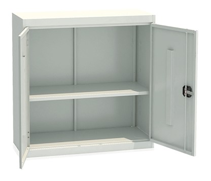 Низкий металлический архивный 2-дверный шкаф. Регулируемая полка, ригельный замок с ручкой, магнитная защёлка для предотвращения открывания дверей. Макс. вместимость папок шириной 55 мм – 32 шт. Максимальная нагрузка на полку 60 кг. Сборно -разборный, на винтах. Шкаф окрашен порошковой краской светло-серого цвета RAL 7035.