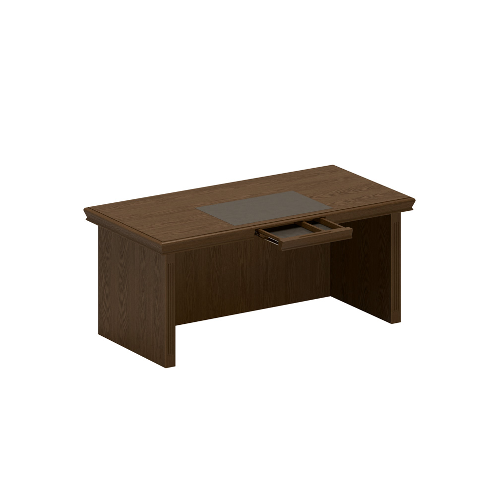 Боковые опоры толщиной 70 мм облицованы с двух сторон натуральным строганым шпоном дуба. Торцы столешницы и опор обложены массивом дуба с фигурным профилем. Лицевая панель(царга) до пола. Изготовлена из МДФ толщиной 17 мм. Облицована с 2-х сторон шпоном. На лицевой части декоративные раскладки из массива дуба. В рабочей зоне столешницы установлен врезной бювар размером 700х450 мм из чёрной экокожи. В торце столешницы , со стороны сидящего выдвижной ящик для канцелярских принадлежностей.